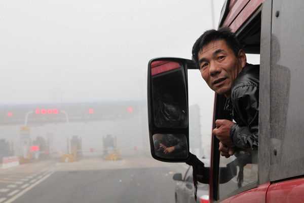 11月3日,车辆在长深高速江苏赣榆入口处排起“长龙”,一名司机在驾驶室等待雾散放行。新华社发(司伟 摄)