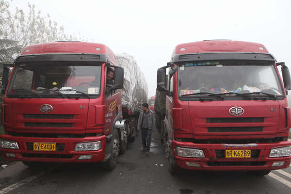 11月3日,车辆在长深高速江苏赣榆入口处排起“长龙”,司机下车查看情况。新华社发(司伟 摄)