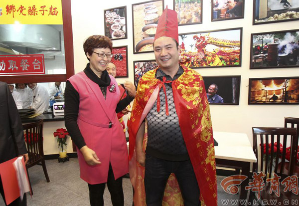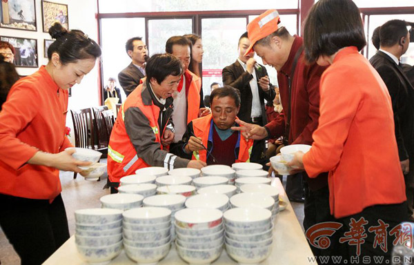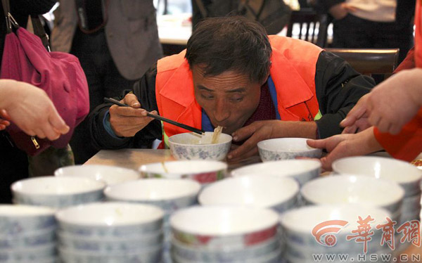 就在其他选手向马景涛祝贺时,第二组比赛开始,37岁的厨师山翠钢和46岁的保洁员郝运动旗鼓相当,80碗、90碗……比赛结束的锣声敲响时,山翠钢以116碗夺得“大胃王”,郝运动以4碗之差居亚军。在发表获奖感言时,四川人山翠钢有点不好意思,“我来陕西7年了,就能吃点细面,结果就用到比赛上了。”