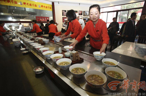 昨日下午,丰庆公园附近一酒店举办了一口香臊子面第一季大胃王比赛,12名选手参赛。比赛分成两组,每组6个人,比赛时间均为10分钟,专门设置传送带为选手上面,并为每名选手配几名服务员端面。