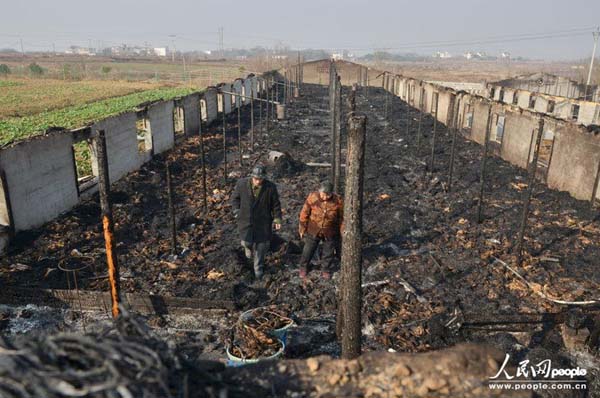 2013年12月22日,安徽省庐江县,被烧塌的鸡棚。马丰成/CFP