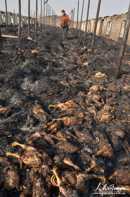 2013年12月22日,安徽庐江,烧塌的鸡棚里堆满了被烧焦的肉鸡。马丰成/CFP