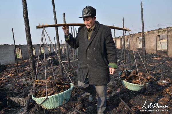 2013年12月22日,安徽庐江,养殖户在清理被烧焦的肉鸡。马丰成/CFP