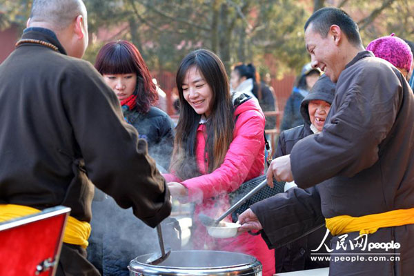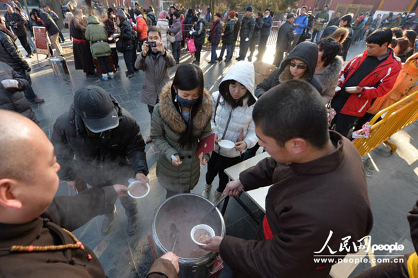 人民网北京1月8日电(记者 翁奇羽)2014年1月8日,大批民众赶来北京雍和宫争喝腊八粥,领粥的队伍有百余米长。当日是中国传统节日腊八节,每年腊月初八民间有喝腊八粥的习俗。雍和宫为进寺的游客免费提供用大米、红枣、莲子、桂圆等多种原料熬制的腊八粥,在寒冷的冬日里送上温暖的祝福。