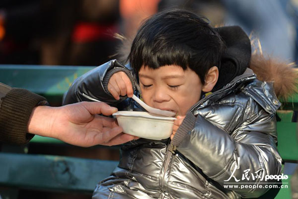 1月8日,孩子大口品尝腊八粥。(人民网记者 翁奇羽 摄)
