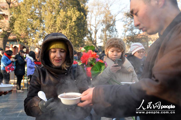 1月8日,外国游客排队领取腊八粥。(人民网记者 翁奇羽 摄)