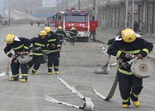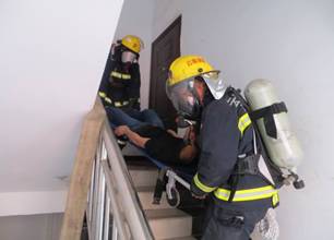 9时38分,消防官兵到达现场,立即成立了火场前沿指挥部,并对现场群众进行疏散,开展火情侦查。根据侦察情况,指挥员迅速下达作战任务,第一组迅速对楼外围观人员划定警戒线,禁止无关人员进入,维持火场周边秩序;第二组由2名战士穿戴好防护装备深入火场内部进行查明起火部位、燃烧物质、燃烧范围、蔓延方向及途径、火势蔓延情况;第三组利用水罐消防车,迅速在楼外架设一支水枪压制大楼外围火势;并沿楼层架设一支水枪直攻火点,实施灭火;第五小组佩戴空气呼吸器和个人防护装备沿疏散楼梯进入楼内搜救被困人员。命令下达后,各小组按照分工救人和灭火战斗同时展开。经过全体官兵20多分钟的全力扑救,“大火”被彻底扑灭,且被困人员安全救出,整个演练过程节奏紧张,气氛高涨,演练取得了圆满成功。