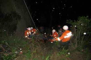 针对现场情况,现场指挥员一边察看桥周围的地形,一边部署救援任务:第一组由两名战士在桥上维持现场秩序,防止大量群众围观有人不慎落入桥下,并严防无关人员下桥踩到石头滚落到桥下对救援人员造成伤害;第二组由其余官兵携带救援担架、安全绳、强光照明灯迅速下桥救人。命令下达后,救援官兵们按照任务部署,紧张有序的展开救援行动。5分钟后,救援官兵即将靠近男子时,该男子突然情绪失控,大声斥责,拒绝接受人员靠近,为稳定其情绪救援官兵只好停止靠近。23时15分,经过救援官兵及其家属的不断劝解,男子情绪慢慢稳定下来,并同意让救援官兵靠近。随即,指挥员立即让救援官兵们将男子挪上救援担架,并从桥上放下两根安全绳固定救援担架两端,以防止运送途中发生意外。时间一分一秒过去,男子在恐惧的情况下情绪波动,时不时的闭眼似睡着状,救援官兵发现后,立即与男子谈话,分散注意力,稳定其思绪。正所谓“下山容易,上山难”,加上天空中下起了绵绵细雨,稍不留神就会滑倒,运送过程显得特别吃力。