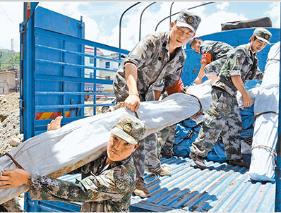5月25日,救援人员在地震重灾区卡场镇搬运救灾帐篷。当日,民政部门紧急调运支援云南盈江地震灾区受灾群众的100吨大米、750件彩条布、4000顶帐篷和2000床棉被等救灾物资陆续运到地震灾区,发放到受灾村民手中。