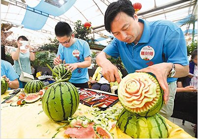 日前,第二十六届北京大兴西瓜节西瓜创意美食大赛在北京大兴庞各庄西瓜小镇举行。本次西瓜创意美食大赛以“甜蜜生活行”为主题,包含西瓜雕刻大赛、西瓜宴创意大赛两项内容。图为参赛选手正在紧张比赛。