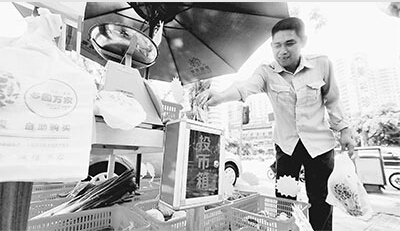 6月16日,一名海口市民挑选蔬菜后付款。近日,海南海口国贸路设立了一处无人售菜摊点,没有人员、设备监控,10余种蔬菜明码标价供市民选购、称重、投币付款,把足够的信任给了顾客。
