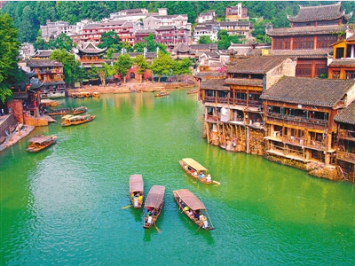 趁着连日来的晴朗天气,大批工匠云集在湖南凤凰古城修复洪灾中受损的吊脚楼建筑群。受“7·15”历史罕见洪灾影响,凤凰古城风景名胜区公共设施和商业店铺部分受损。自26日起,凤凰古城风景名胜区实施灾后过渡期开放。图为7月27日,游客们在沱江泛舟,欣赏两岸风光。