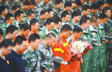 8月10日上午10时,云南省为鲁甸地震中的遇难同胞举行全省公祭。图为在震中的鲁甸县龙头山镇,救援人员与灾区人民一起,默哀三分钟,悼念在地震中罹难的亲人。