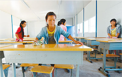 8月31日,几名学生在云南鲁甸地震震中龙头山镇的龙泉中学临时活动板房学校的教室内打扫卫生。目前,地震灾区两市五县区所需的转移安置学校活动板房已全部搭建完毕并交付使用,灾区所有学校9月1日按期正常开学。