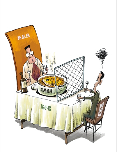 在广州市翠悦湾小区,区内既有商品房,也有解困房,相邻而立。由于解困房物业费较低,商品房业主和物业管理单位竟单方面修建了一道铁丝网围墙,将小区公用的配套公共设施圈在了商品房范围之内。当地街道办多次介入调解却屡屡受阻。