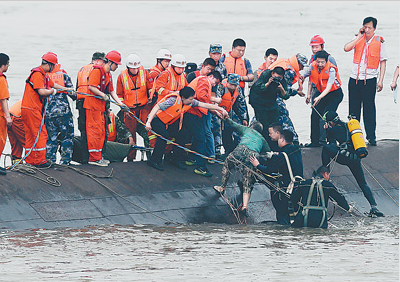 六月一日晚,从南京驶往重庆的客船“东方之星”轮在长江中游湖北监利水域发生翻沉。图为六月二日,救援人员成功救起一名幸存者。