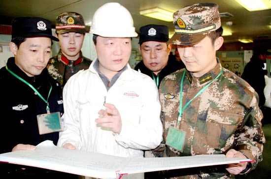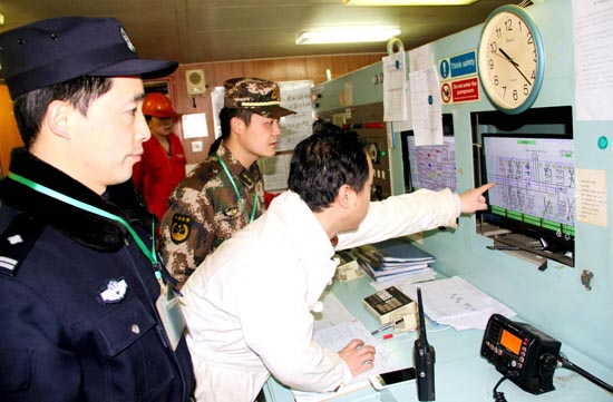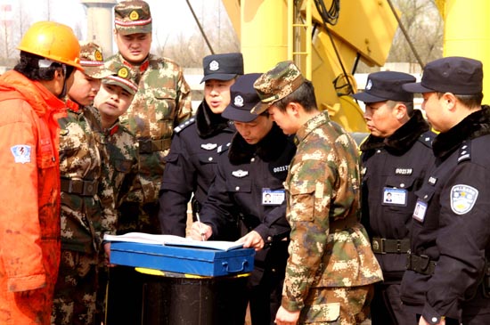 3月1日,江苏省仪征市南京港码头,长航南京公安局仪征派出所干警、武警仪征公安边防二中队官兵和南京港码头民兵组成的“两会”安保联防队正在巡逻、检查。全国“两会”召开在即,滨江仪征启动军警民联防联动机制,从3月1日起,对长江岸线所有进出港口的船舶,进行严格检查,严格管理,强化港口消防、治安和人员出入境管理,确保管辖区域安全。(吕才林 刘 虎 周晓明)
