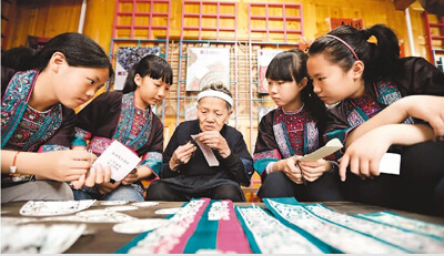 5月18日,几名小学生在广西三江侗族自治县同乐苗族乡同乐村平溪屯的三江侗绣博物馆内观看当地绣娘剪纸。孩子们通过零距离接触剪纸、刺绣、织布等传统技艺,感受侗族原生态耕织文化。