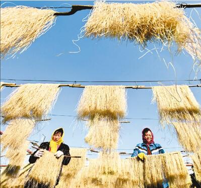 冬闲时节,山东省沂源县积极引导农民变冬闲为冬忙,当地广大农民围绕“一村一品、一镇一业”,大力开展冬季创业增收。目前,全县形成加工、养殖、种植等冬季增收产业项目160余个,从业农户达到1万余户。图为11月27日,鲁村镇泉子官庄村的农民在晾晒加工的粉条。