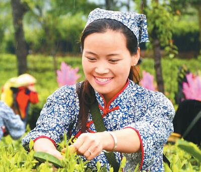 4月17日,女孩们在“千年茶乡”——云南省昌宁县的生态茶园采摘茶叶。