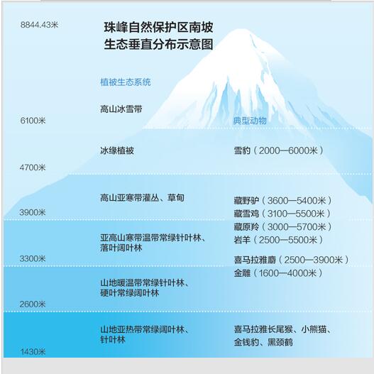 从海拔1400多米的南部河谷地带一直攀升到珠穆朗玛峰,珠峰自然保护区的相对高度落差达7400多米,拥有全球独一无二的极高山生态系统,原始的山地森林生态系统以及半干旱荒漠灌丛、草原生态系统,成为全球最丰富独特的天然物种基因库。