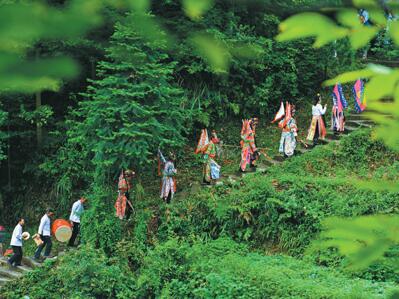 7月12日,演出途中,戏班成员走在乡间的小路上。