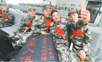 图为即将离开家乡的新兵在自拍。