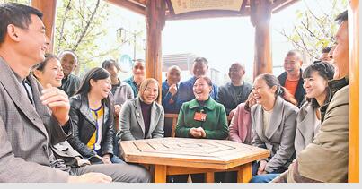 连日来,各地迅速兴起学习宣传贯彻落实十九大精神的热潮。图为党的十九大代表、四川省蒲江县西来镇两河村党支部书记姚庆英(前排中)正在向村民宣讲党的十九大精神,村民们喜笑颜开,表示要努力建设更加美好的新农村。