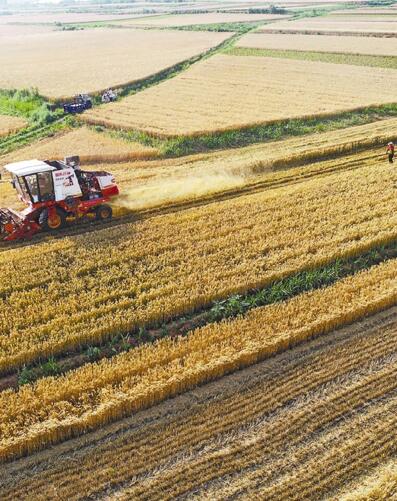 图为近日,河南省宜阳县白杨镇高头村农民趁晴好天气抢收小麦。