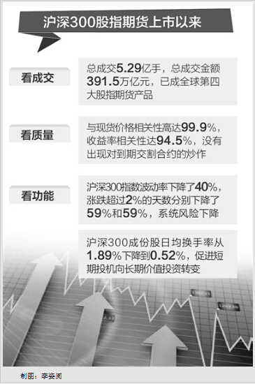 自2010年4月16日上市以来,沪深300股指期货市场交投活跃。上市至今,总成交5.29亿手,总成交金额391.5万亿元,日均成交48.79万手,日均成交金额3606亿元。从单个产品的交易量来看,沪深300期指已成全球第四大股指期货产品。