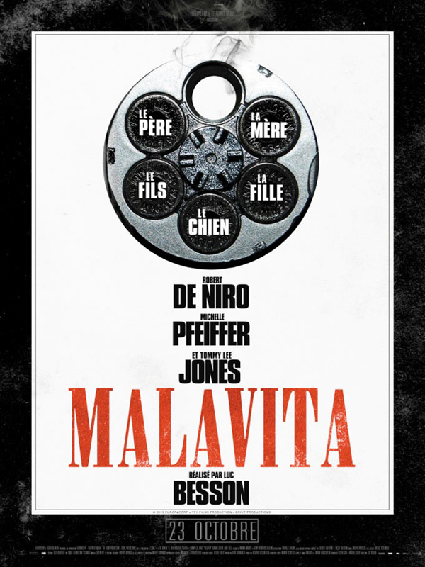 在最新款海报中,硕大的左轮手枪弹夹占据了重要位置。其中,五颗子弹上分别写有“爸爸”、“儿子”、“妈妈”、“女儿”和“狗”的字样,最上面一颗已经出膛的子弹位则冒着硝烟。这款海报暗示了由罗伯特·德尼罗、米歇尔·菲佛等组成的黑帮家庭中任何一个成员都可能成为一触即发的子弹,甚至连家庭中的狗也是不好惹的爆裂脾气,令《追杀令》浓郁的黑帮气质一览无遗。
