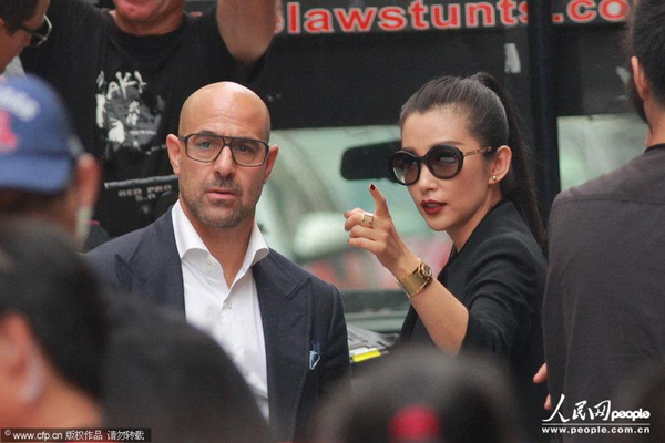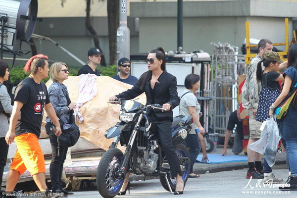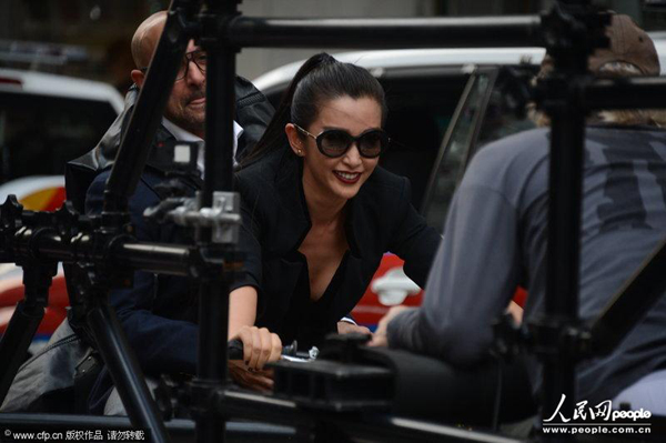 10月20日,电影《变形金刚4》香港热拍。记者在香港深水埗首次拍到中方女演员李冰冰剧中造型。当日,李冰冰一身黑色利落西装,烈焰红唇,冷艳疏离,气场爆棚,造型颇像美剧中“怪咖女科学家”,与变4导演迈克尔贝一贯喜欢的美艳性感、强势干练的形象一脉相承。据悉李冰冰在戏中饰演的是制造变形金刚的公司首席女科学家,堪称变形金刚之母。造型上美艳、冷酷,要挑战的是智慧与美貌并重,性感与力量兼具的“金刚芭比”似的角色。记者在片场拍到李冰冰一到片场就与导演亲密相拥,相谈甚欢,原本黑面的迈克尔贝看到冰冰到场终于露出笑容,看起来对这位中方女演员喜爱有加。当日正在拍摄的是一场闹市飞车戏,李冰冰似足香港古惑仔大姐大,帅酷美艳的金刚芭比飞车决战,场面激烈,扣人心弦。剧组甚至封闭了深水埗两条街区进行拍摄。CFP/CFP