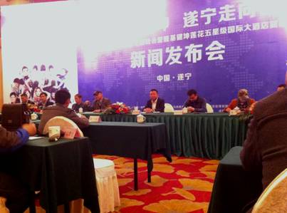 香港健坤国际集团董事局副总裁史海刚、东盟-中国经济贸易发展促进会大中国区秘书长、马来西亚隆基马中集团中国区CEO曹鲁斌、旅游卫视抢签《最美中国》 总制片、香港世纪豪情国际传媒集团总裁朱军、遂宁健坤城策划经理杜学喜等出席新闻发布会。发布会上,史海刚就2013年健坤国际与隆基马中集团合作作了详细介绍,两企业还在新闻发布会上作了交流探讨。而此次新闻发布会的召开,也标志着未来的招商工作全面展开。