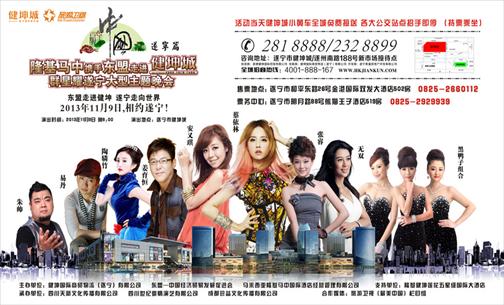 2013年11月9日,旅游卫视“最美中国”遂宁篇、隆基马中携手东盟走进健坤城、“群星耀遂宁”大型主题晚会将在遂宁市168米最高的地标性建筑“健坤国际5A甲级写字楼”旁盛大开演 。届时,姜育恒、蔡依林、安又琪、黑鸭子组合、无双、朱帅、张睿、易丹、陶辚竹等当红明星将赴遂表演,共同祝贺隆基健坤莲花五星级国际酒店、隆基健坤四星级酒店项目全面动工。