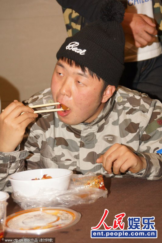 2014年01月13日讯,湖南省长沙市,12日,杜海涛、王乔、胡东、孙亮、陈泽宇及刘洲成因参加山东卫视录制《烈火雄心》节目而结识,肝胆相照惺惺相惜并自发组成了“六壮壮”在节目中不畏艰险一次次的挑战自我。杜海涛狼吞虎咽吃个不停,还与与胡东“舌吻”博眼球。