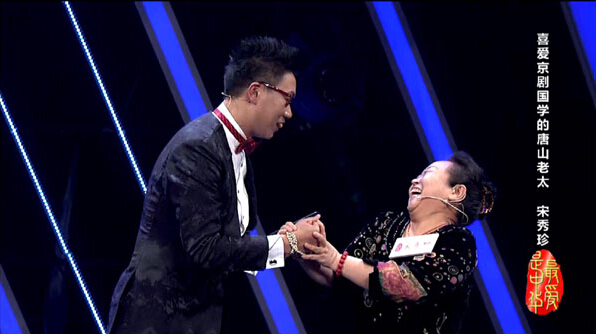 这位唐山大妈宋秀珍虽然已经六十岁,却精气神十足,浑身活力四射,一上场就掏出条珠链拴住主持人林海,“我闺女是你脑残粉”,声称要把他拉回家去,吓得主持人忙喊自己“已经结婚了”,幽默的宋大妈表示只是个玩笑而已啦。之后大妈更禁不住用手捏了捏主持人的脸蛋,“是真人,是真的”,看来不光大妈的女儿,大妈本人也是林海的脑残粉。精神头倍儿棒的宋大妈,现场秀起了才艺,但京剧穆桂英刚唱了个开头,大妈就不干了,“导演太不到位了,我这嗓子忒干,咋不给我点音乐?”等音乐到位了,谁知大妈却唱起了青藏高原,不按常理出牌的唐山老太,每句话都让观众笑得前仰后合。