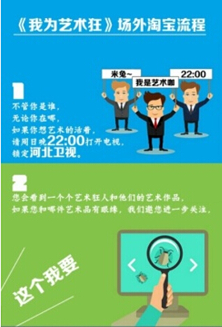在这样的前提下,《我为艺术狂》栏目组开辟了一条新型的商业模式道路,充分利用新兴的电商模式和新媒体资源:除了在线下可通过官网、微信,电话购买,微博咨询之外;在现场录制或节目播出时还可进行同步竞拍,充分增加了观众的参与度和增强了观众的用户体验感官,互动性极强。让观众们不仅不再觉得艺术品和收藏品是遥不可及的奢侈品,而且更深一步的了解到了这个只针对小众人群的艺术品市场。将艺术狂人从幕后引到台前让,让他们用最通俗易懂的语言来介绍自己带来的作品或者创意,在现场亲自进行展示和解说,诠释新艺术内涵。让观众们对艺术品的概念也不再抽象,更加具体和形象化的了解才能真正起到普及艺术理念和扩大艺术品交易市场的目的。