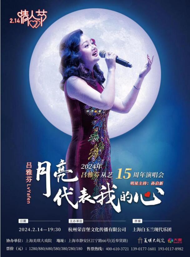2024年2月14日,正值吕雅芬从艺十五周年之际,为答谢新老朋友的厚爱与支持,上海美琪大戏院即将迎来一场别开生面的情人节演唱会,不仅有老少皆宜的邓丽君金曲逐一奉上,同时还特邀明星主持孙启新老师现场嘉宾主持,还特邀沪上知名萨克斯演奏家汤迎、特邀沪剧表演艺术家吴嵘璟、特邀知名歌星李海云、特邀新疆知名“小邓丽君”苏毛毛,以及来自阿根廷的著名表演艺术家Nicolas Leandro等一众名人参与……群星荟萃,燃情奉献,只因2月14当天,是情人节,也是吕雅芬从艺十五周年庆,更是她的生日,可谓是“三喜临门”。
