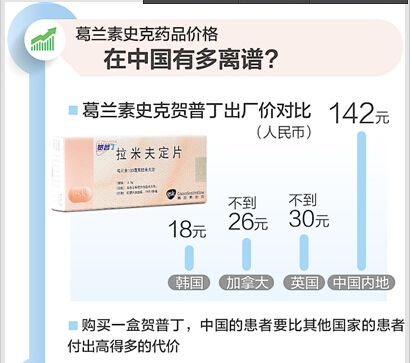 (本报记者 张 洋)葛兰素史克旗下的“明星”药品在中国高昂的定价,令人印象深刻。以贺普丁为例,在中国的出厂价是142元人民币,而在韩国只有18元,在加拿大不到26元。也就是说,购买一盒贺普丁,中国的患者要比其他国家的患者付出高得多的代价。