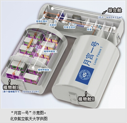 刘红说,“月宫一号”由1个综合舱和两个植物舱组成,总面积为160平方米,总体积500立方米。其中,综合舱包括居住间、工作间、洗漱间、废物处理间等。每个植物舱分隔为2个植物种植室,可以根据不同植物生长需要独立控制环境条件。