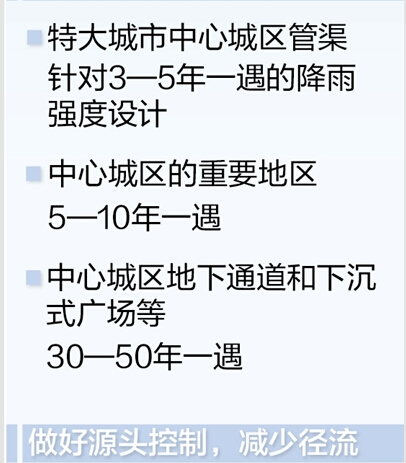 不过今年2月起实施的《室外排水设计规范》已明确提高了城镇内涝防治设计标准:城镇雨水管道设计标准按城镇类型与城区类型划分,经济条件较好且人口密集,内涝易发的城镇宜采用规定上限。例如特大城市中心城区为3至5年一遇,中心城区的重要地区为5至10年,中心城区地下通道和下沉式广场等要30至50年。