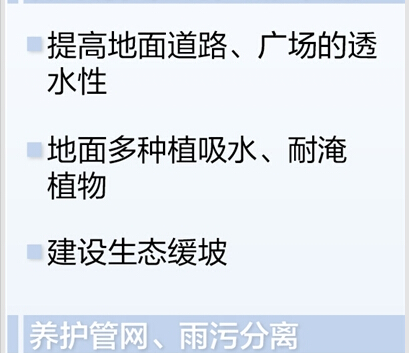 首先要做好源头控制,减少进入排水管网的径流。城市建设初期,下一场雨可能只有30%的雨水形成径流,剩下的都通过植被、土壤渗透涵养了。如今,城市铺设了大量硬质路面,建设了大量“光面”建筑物,可能七八成降水量都汇成径流了。那么减轻排水压力,就要在土地开发建设的时候注重规划,提高地面道路、广场的透水性。此外,城市应增加地面的吸水、耐淹植物,建设生态缓坡。