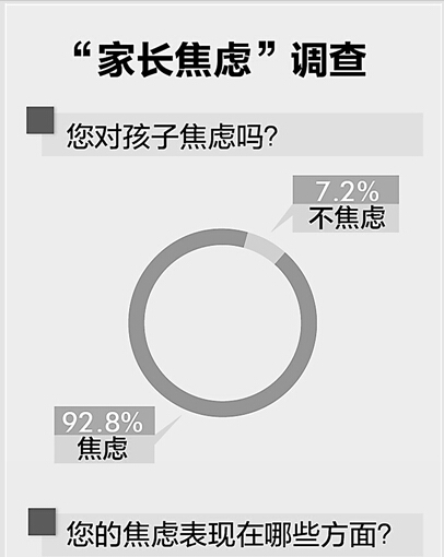 人民网强国论坛近期开展的一项调查显示,在有子女的被调查者中,92.8%认为自己对孩子的成长、教育存在焦虑。而在全部被调查者中,98.6%认为身边有家长存在焦虑现象。