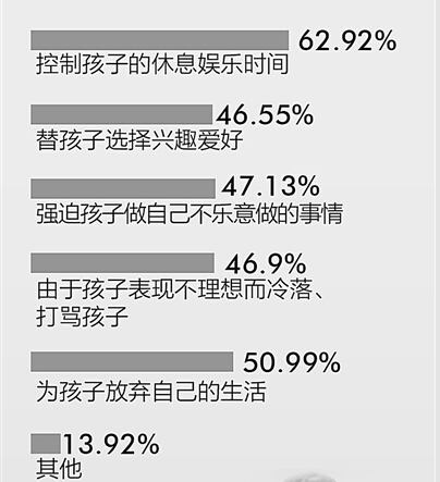 中国青少年研究中心组织的调查显示,83.6%的中学生家长要求孩子考到班级前15名,小学家长的期望更高。而在北京市石景山区某幼儿园任教的张女士说,虽然很多小学取消了幼升小的面试,但其所在幼儿园大班的所有孩子都有课外班,如口才、认字、心算、各种类型的画画、乐器和各种运动。此外,还有1/4左右孩子去上幼小衔接班,提前学习拼音、算术等小学知识。