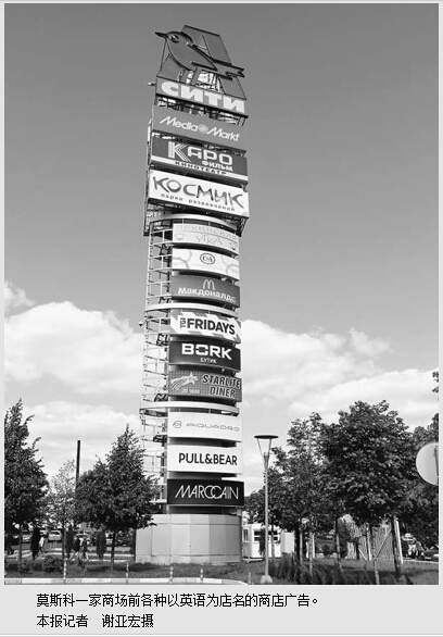 根据记者观察,外来语滥用的情况在俄罗斯确实比较严重,“hi—tech”(高科技)、“weekend”(周末)、“chart”(榜单)等外来词在俄语中的使用越来越普遍,商店也越来越喜欢用外语命名。俄罗斯普希金俄语学院语言学教授弗拉基米尔·阿努什金在接受本报记者采访时指出,在经济全球化的影响下,俄语受英美语言和文化的影响越来越深,许多俄罗斯人为此忧心忡忡。