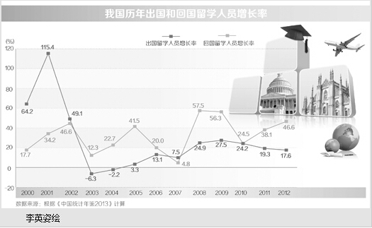 教育部发布的《2013回国留学人员就业报告》显示,当年我国各类留学回国人员总数达35.35万人,是同期出国留学人数的85.4%。对比前几年的数据会发现,回国人数正快速增加。2001年我国留学回国人员为1.2万人,2005年增加到3.5万人,2009年进一步突破10万人大关,达到10.8万人,2012年更飙升到27.3万人。同期,我国出国留学人员虽然也在快速增加,但增速明显低于回国留学人员。