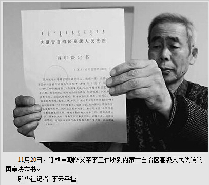 本报呼和浩特11月20日电 (记者徐隽、吴勇)备受社会关注的呼格吉勒图案有了最新进展。11月20日上午,内蒙古自治区高级人民法院向该案申诉人、呼格吉勒图的父母送达了再审决定书,正式启动对该案的再审程序。