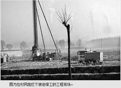 1月23日我们专程去了淹村。果然,在淹村公路边一块面积约七八亩的田地里,我们看到场地上停放着车辆和施工机械设备,上面已打起了几个水泥桩,看样子工程刚开工不久,现场还有不少村民看守着,不准动工。
