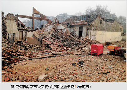 3月9日,南京市文化综合执法总队接到颜料坊49号两进房屋遭毁坏的举报后,会同南京市秦淮区文化执法大队赶赴现场,发现该处文物保护单位旁,泰禾集团南京吉庆房地产有限公司正在进行桩基施工,两进古建筑被损毁。南京市文化综合执法总队调查发现,泰禾集团南京吉庆房地产有限公司明知该处为市级文保单位,野蛮施工导致文物遭损毁,严重违反了《文物保护法》。为抢救文物,南京市文化综合执法总队当场要求建设单位立即停止施工,并下达停工通知书。