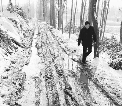 几十年来,这条路晴天尘土飞扬,雨雪天泥泞不堪(见图)。村民如果得了急病,救护车很难前来救治。谁家若发生了火灾,消防车也很难来灭火。特别是张梁村更是苦不堪言,每遇到雨雪天,小学生上学都是家长身背肩扛踏着泥泞送往学校。好多姑娘不愿嫁到该村。谁家有个红白喜事亲朋好友很难前来做客,收获庄稼更是难上加难。